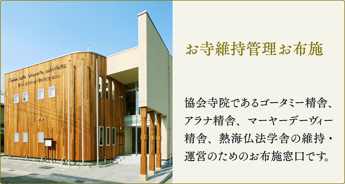 日本テーラワーダ仏教協会が行っているサンガの維持や伝道活動は、皆さまの温かいご支援により支えられております。 お釈迦様の教えをより広く伝えるため、ご協力よろしくお願いいたします。